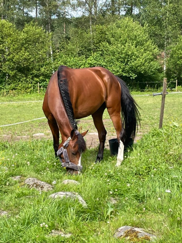 I september 2024 fick vår finaste stjärna Mini somna in akut efter en allvarlig skada i ena benet. Veterinären bedömde att där inte fanns någonting att göra och hon togs bort direkt på plats. Liam med familj såg till att hon fick en fin sista stund, med smärtlindring, massor av äpplen och kärlek från alla närvarande. En oerhörd och väldigt plötslig sorg, men tyvärr kanske också en del av livet med häst. Hon fattas både oss här hemma och familjen Ahlberg, men vi är så tacksamma för den resa hon fick göra och allt roligt hon fick uppleva hos dem, gnistan tändes verkligen under hennes sista månader.